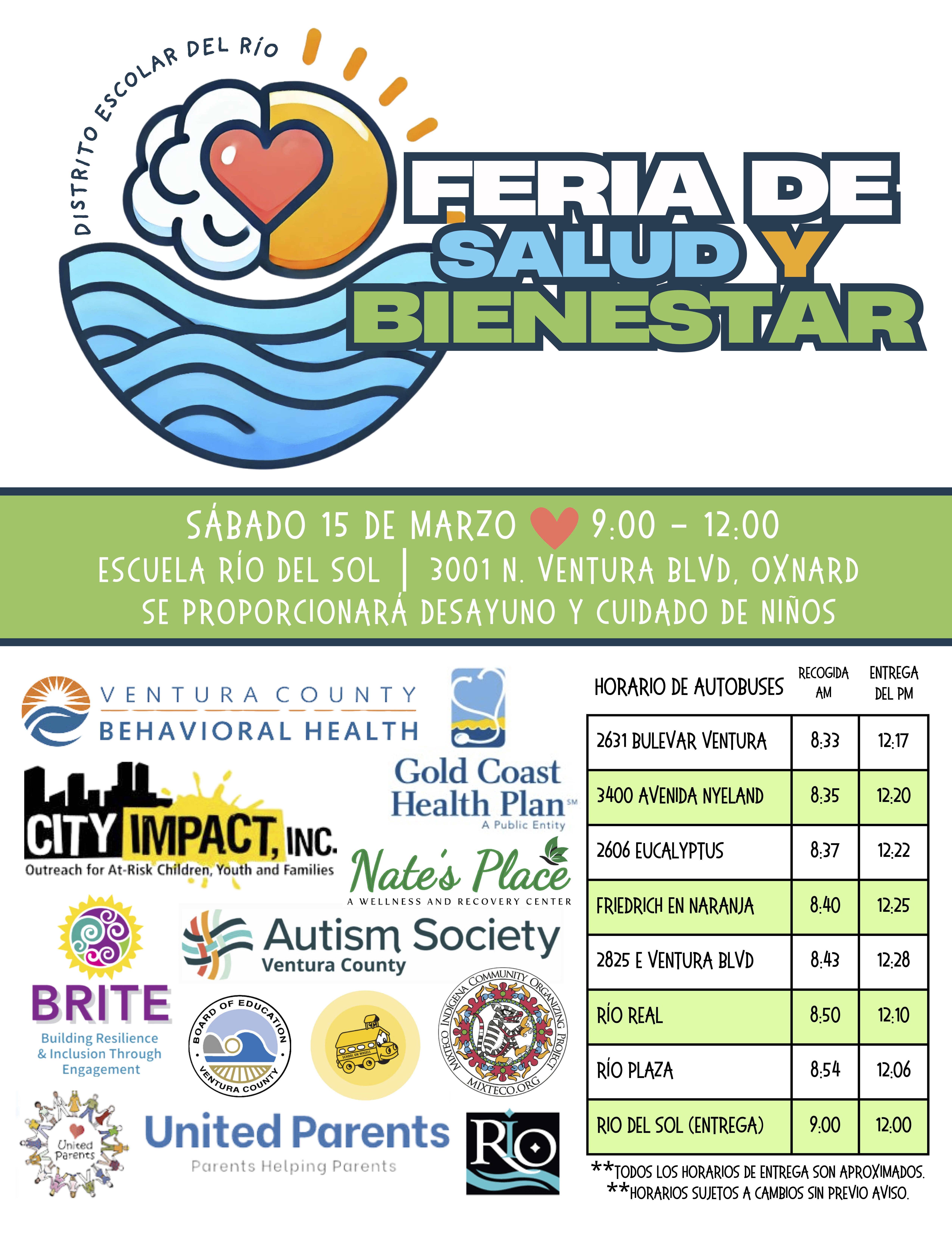 Rio School District Health and Wellness Fair Saturday March 15th 9am-12pm located at Rio Del Sol School 3001 N. Ventura Blvd. Transportation, Breakfast and Childcare will be provided. Come and visit and learn from many of local partners.