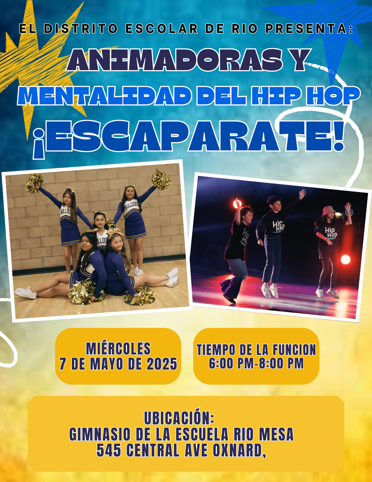 Rio School District Cheerleading & Hip Hop Mindset Showcase! Wednesday May 7th from 6-8pm at Rio Mesa High School Gym 545 Central Ave. Oxnard